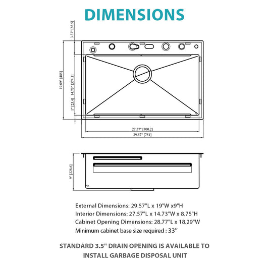 30" Single Bowl Kitchen Sink With Smart LED Faucet