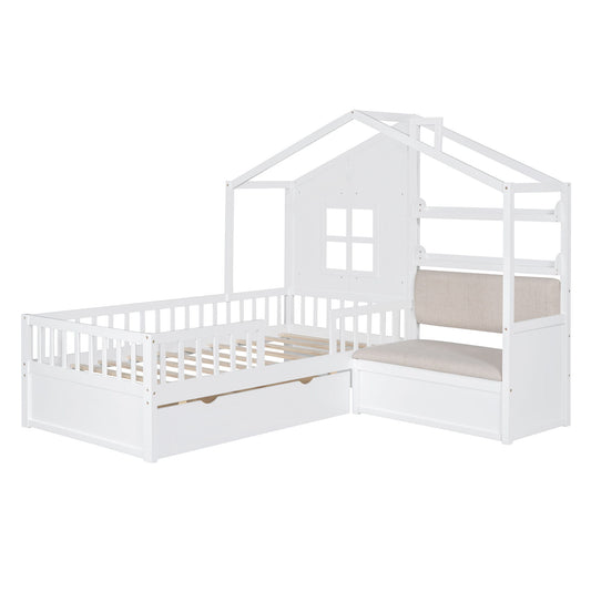 House Bed With Sofa, Kids Platform Bed With 2 Drawers And Storage Shelf