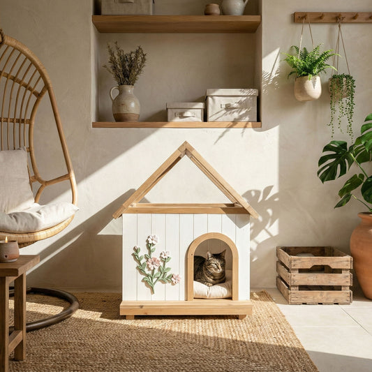 Daisy Cat House With Roof & Indoor Outdoor Pet Shelter For Cats & Small Dogs (11–25 Lbs) - White / Wood