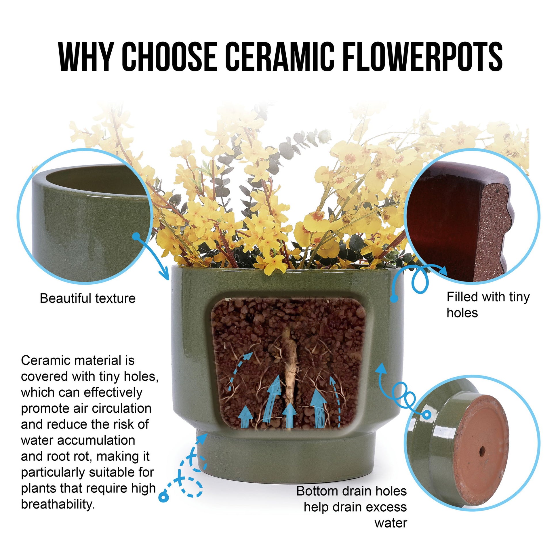 3 Pieces Ceramic Flowerpot, Planter For Patio, Garden Or Windowsills - Antique Light Green