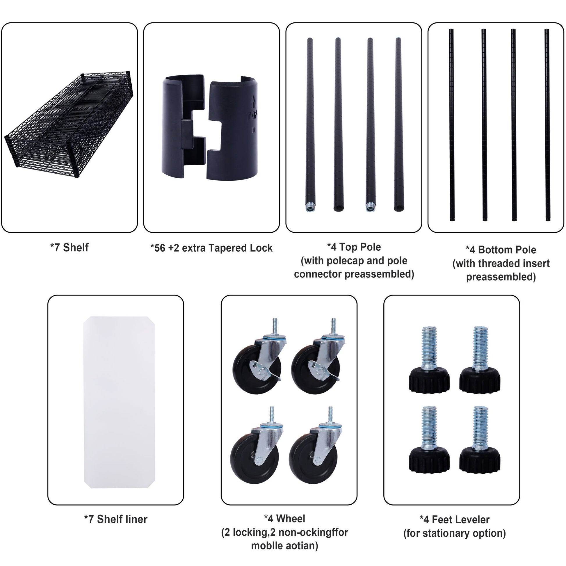 7 Tier Metal Shelf Wire Shelving Unit, 2450Lbs Heavy Duty Adjustable Storage Rack With Wheels & Shelf Liners For Closet Kitchen Garage Basement Commercial Shelving - Black