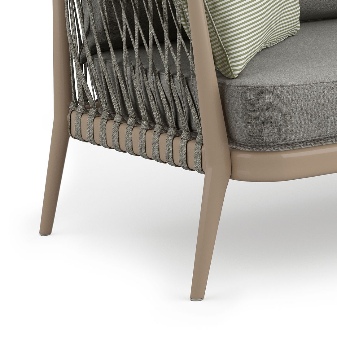 - Sofa frame, base and legs are built with rust resistant aluminim finished with a powder coated finish in Sand Drift