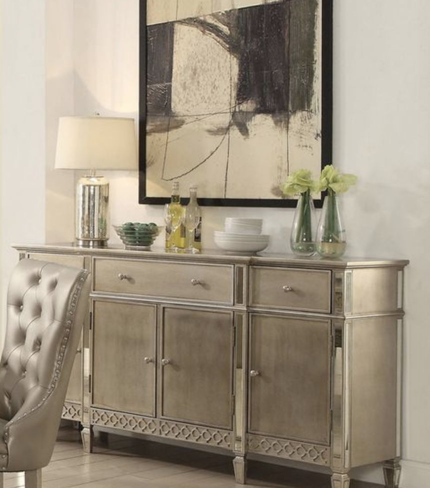 - Elegant Design: This server boasts a mirrored and champagne finish, exuding sophistication and elegance in any dining or living space. Its rectangular design with a wooden top and geometric apron-base trim provides a timeless look.