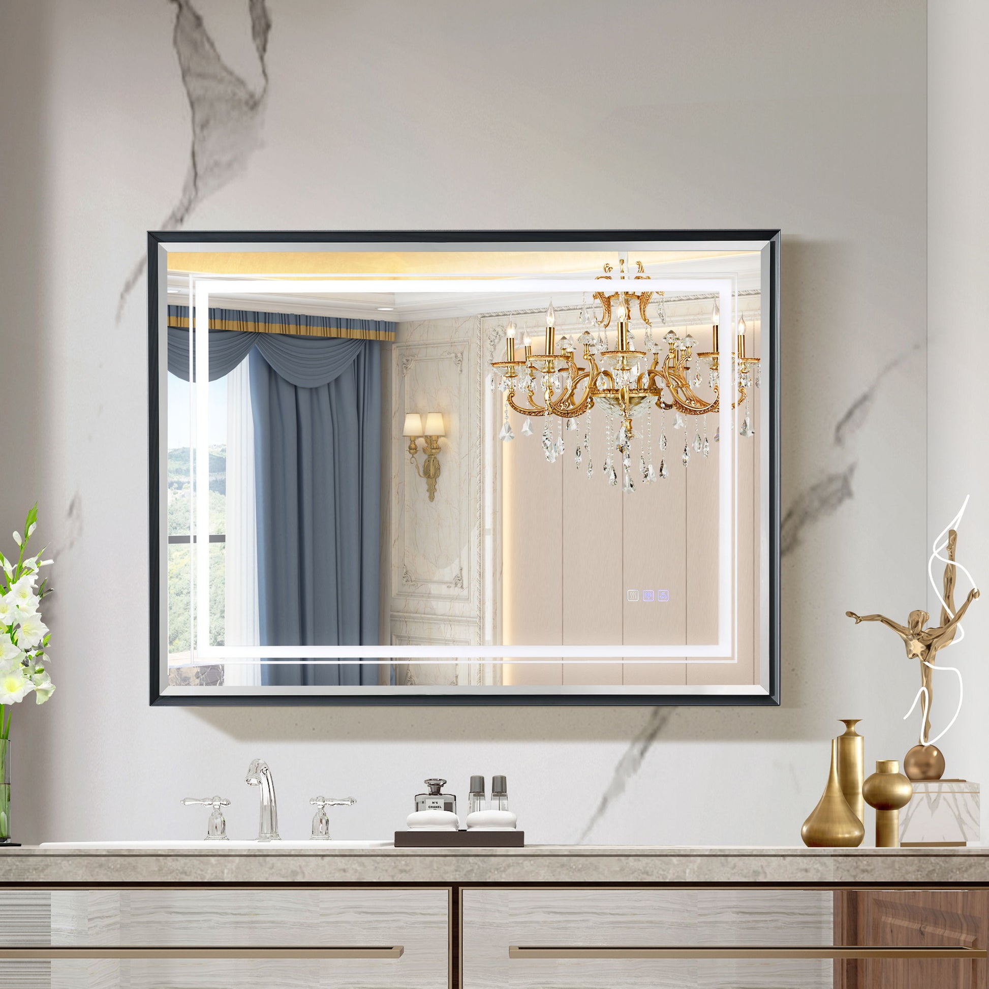 40*30" LED Bathroom Beveled Mirror, 3000 - 6000K Gradient Front And Backlit LED Mirror For Bathroom, 3 Colors Dimmable, Ip54 Enhanced Anti - Fog, Hanging Plates Wall Mount Lighted Mirror - Gray
