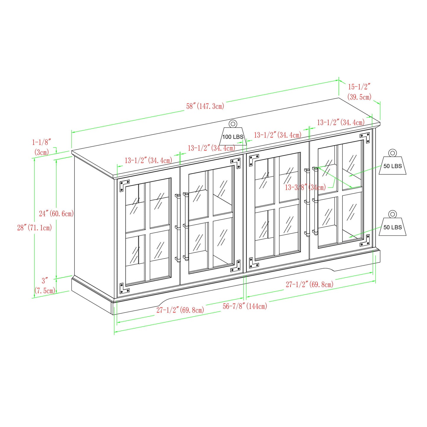 58.0"W x 16.0"D x 28.0"H - 95.0 lb