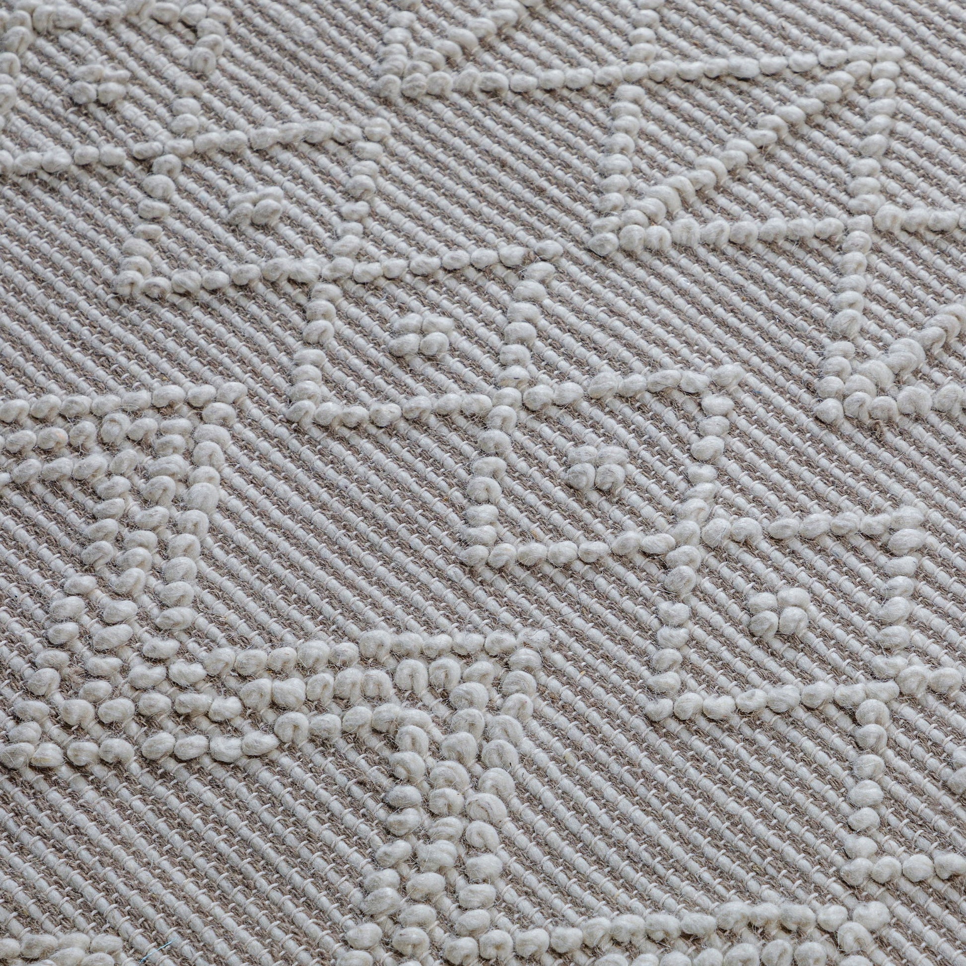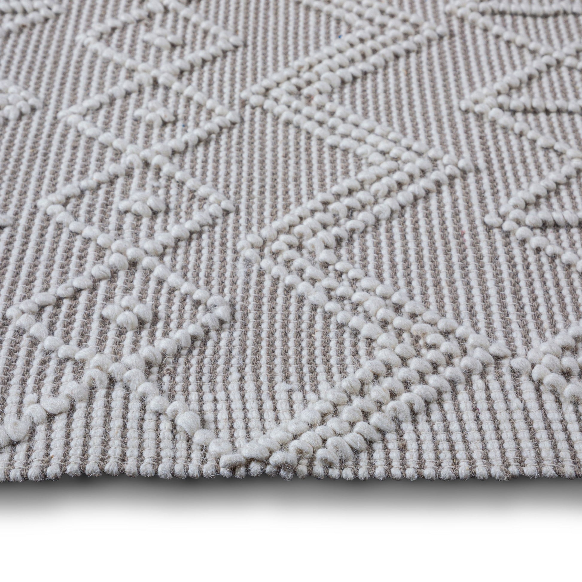 - Detailed with a geometric pattern in ivory and taupe featuring a hand-knotted fringe