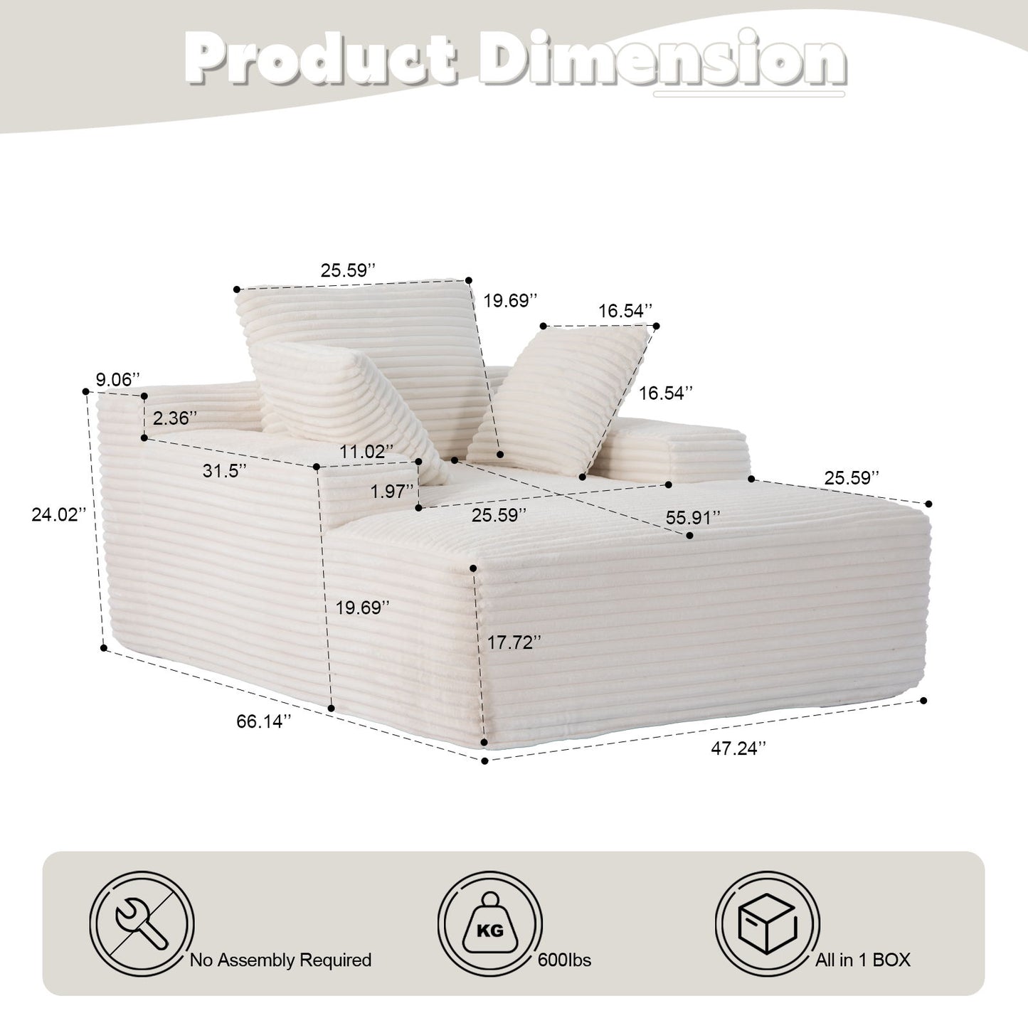 Oversized Chaise Lounge Chair Cozy Cloud Couch, Plush Corduroy Upholstered Sleeper Sofa Daybed With 3 Throw Pillows And Wide Armrest For Living Room - White