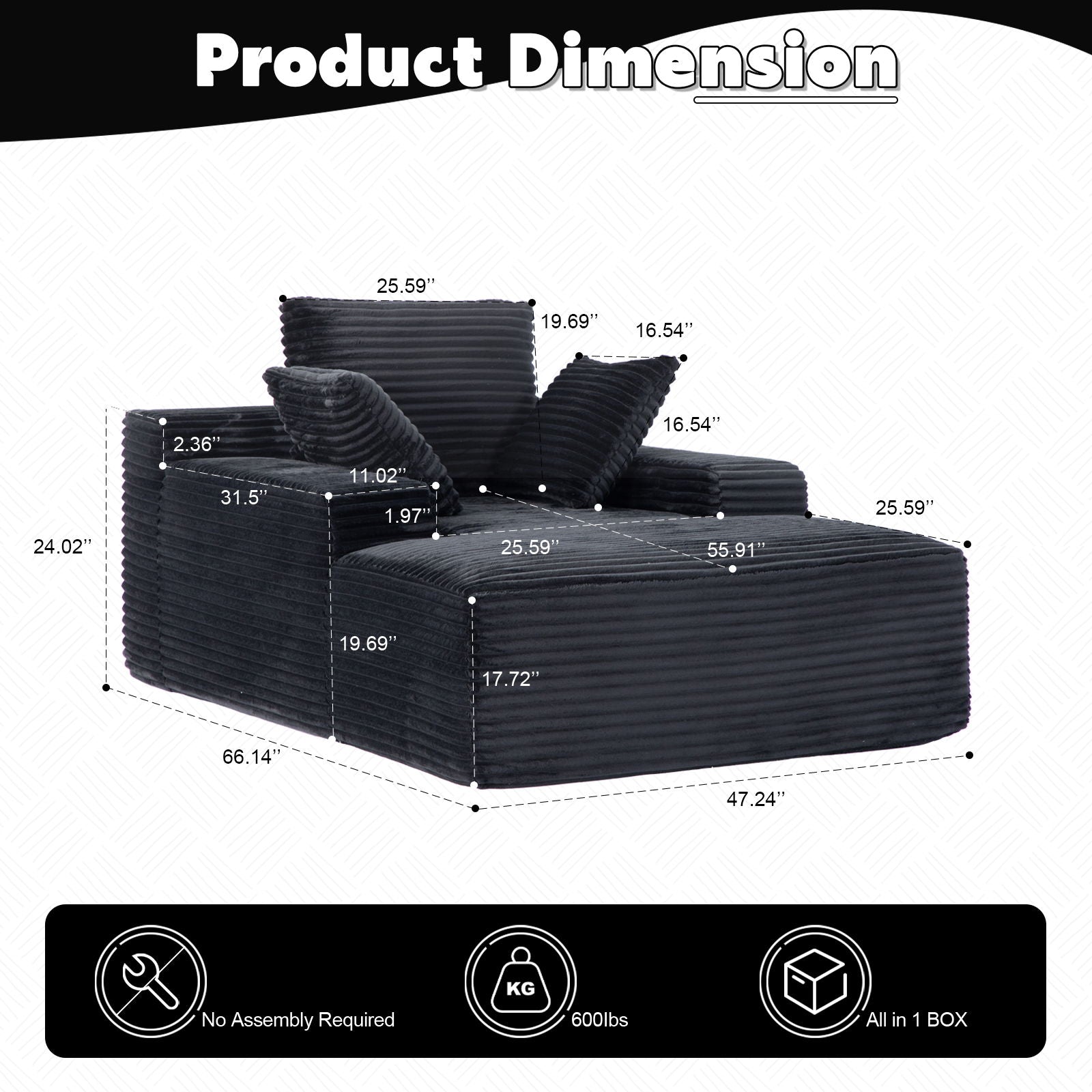 Oversized Chaise Lounge Chair Cozy Cloud Couch, Plush Corduroy Upholstered Sleeper Sofa Daybed With 3 Throw Pillows And Wide Armrest For Living Room - Black
