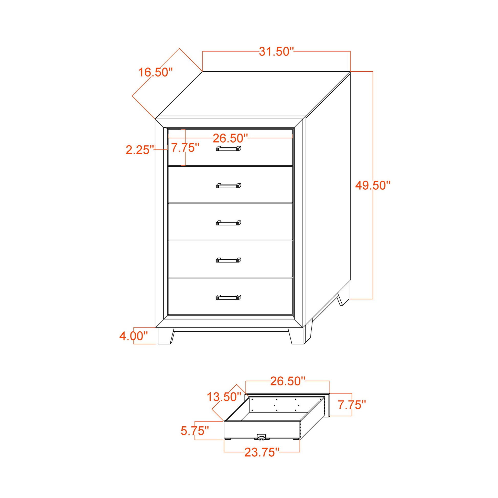 - 5 Drawer Chest: Provides ample storage for clothing, linens, and personal items.