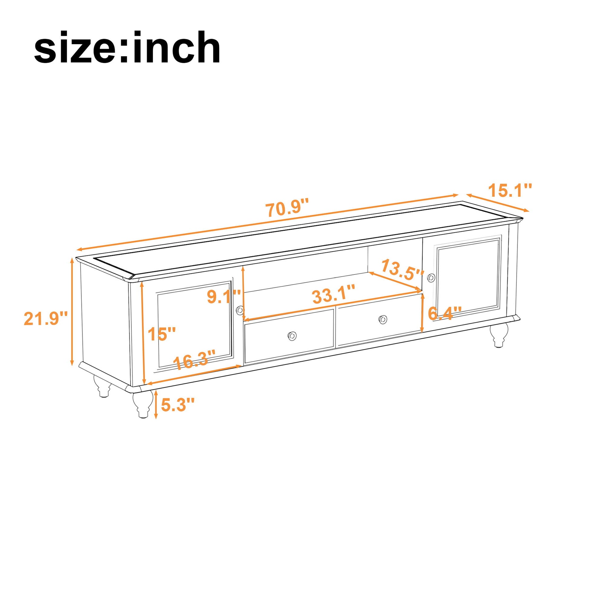- Thoughtful Design: With 2 large cabinets, 2 drawers, and open compartment, this TV stand keeps media devices, collections, and decor neatly organized.