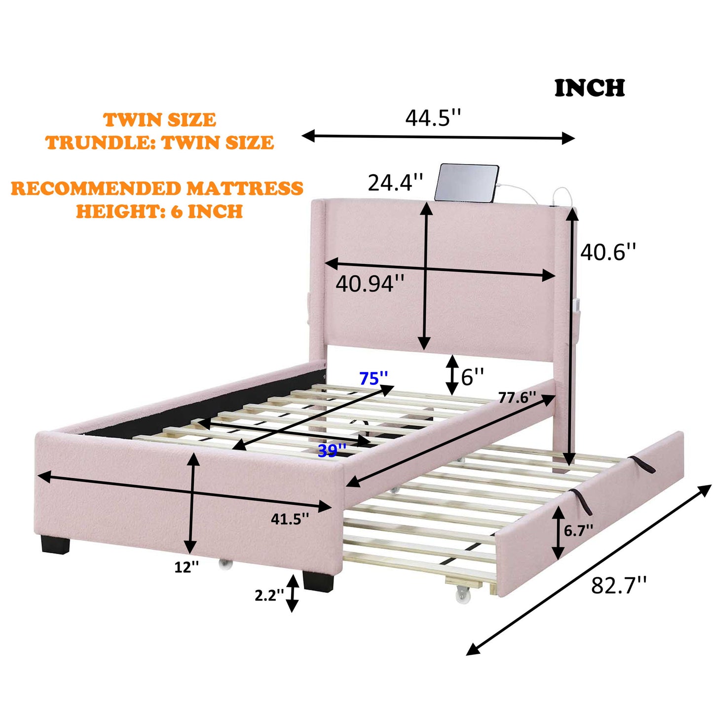 Twin Size Upholstered Bed Frame With Trundle Bed, Teddy Fabric, USB Functionality, And A Pocket Design On The Side Of The Headboard For Storing Small Items - Baby Pink