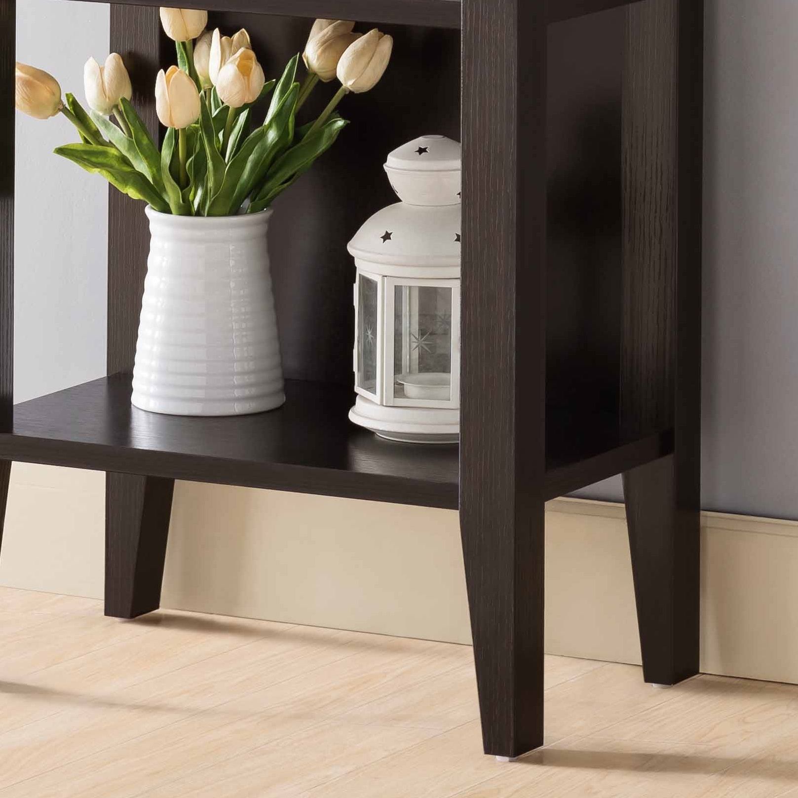 - Material and Finish: Made from particle board and MDF, the rack features an espresso finish, blending seamlessly with various decor styles.
